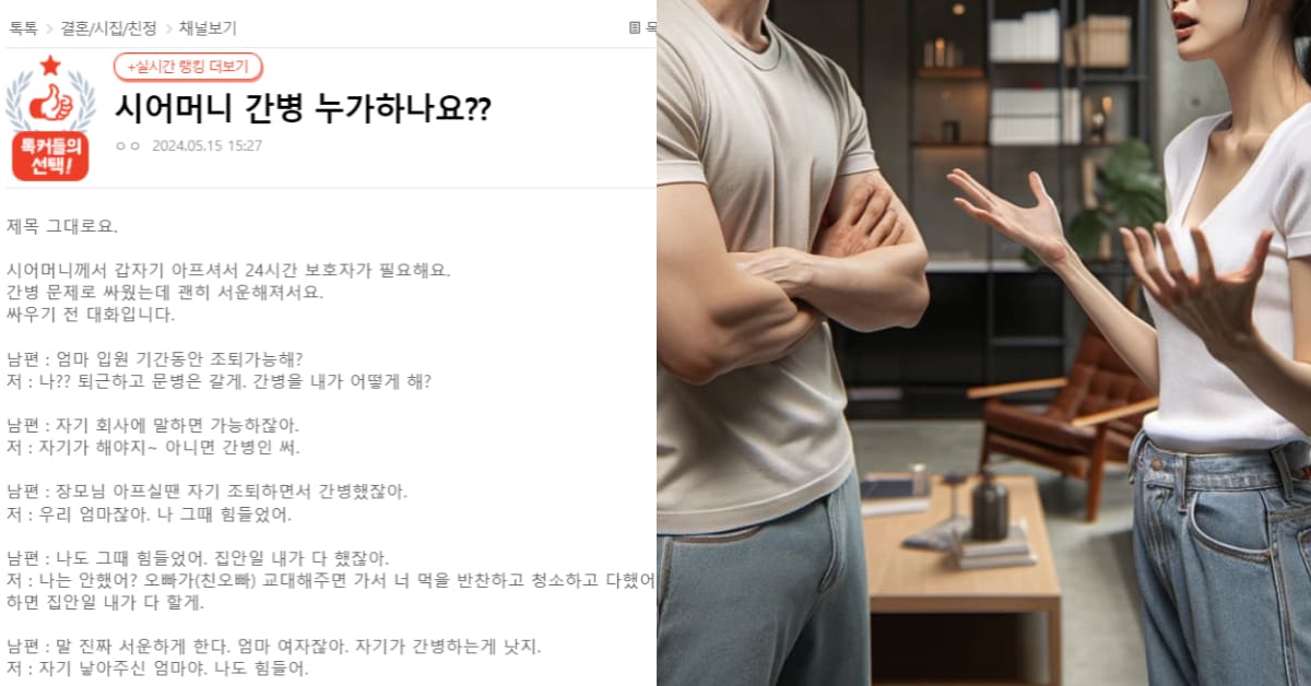 이 여성은 시어머니의 갑작스러운 건강 악화로 인해 생긴 간병 문제로 남편과 의견 충돌을 겪고 있다고 밝혔다.