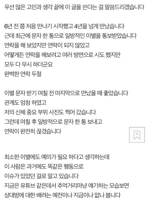 당시 글 작성자는 "4년간 만났던 배우 L씨가 잠수 이별했다"라며 "최근에 문자 한 통으로 일방적인 이별을 통보받았다. 이별 문자 받기 며칠 전 마지막으로 만났을 때도 좋았다. 관계를 했고 제 신체 중요 부위 사진도 찍어갔다. 그런데 며칠 후 일방적으로 문자 한 통 보내고 연락이 완전히 끊겼다"라고 이야기했다.