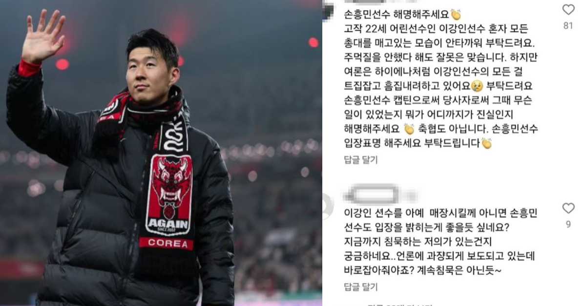 한 네티즌은 손흥민의 SNS에 "고작 22세 어린 선수인 이강인 혼자 총대를 매고 있는 모습이 안타까워 부탁드린다"라며 "이강인의 잘못은 맞지만 여론은 하이에나처럼 이강인의 모든 걸 트집 잡고 흠집 내려 하고 있다. 손흥민이 캡틴으로서, 당사자로서 무엇이 진실인지 해명해 달라. 입장표명 부탁드린다"라는 댓글을 달았다.