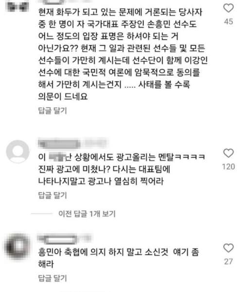 한 네티즌은 "이 상황에서도 광고올리는 멘탈. 진짜 광고에 미쳤나? 다시는 대표팀에 나타나지 말고 광고나 열심히 찍어라"라며 악플을 달았다.