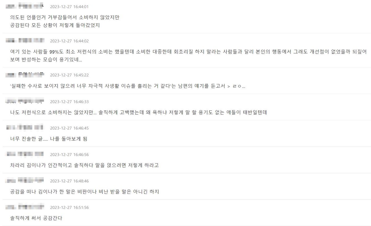 이를 본 네티즌들은 "공감함.. 그래서 이런 비슷한 이슈에 대해 최대한 말 얹지 않으려 함", "녹취 이런건 안 들었지만 대부분 그러지 않을까 싶네", "악플러들도 잘못했고 악플 안 쓴 사람들도 비겁했지", "의도된 언플인 거 거부감 들어서 소비하지 않았지만 공감된다 모든 상황이 저렇게 돌아갔었지" 등의 반응을 보이며 김이나의 글에 공감을 표하고 있다.
