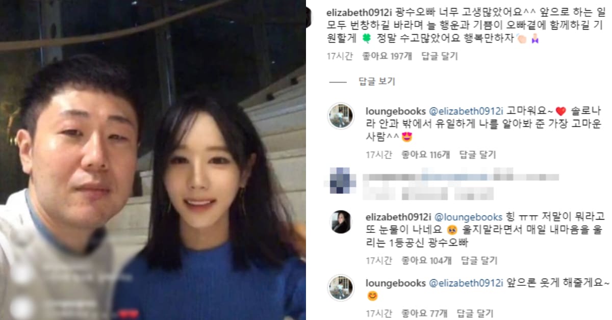 광수의 답글에 옥순은 또 다시 "힝 ㅠㅠ 저말이 뭐라고 또 눈물이 나네요 울지말라면서 매일 내마음을 울리는 1등공신 광수오빠"라며 댓글을 남겼는데 광수가 "앞으론 웃게 해줄게요~"라며 이미 현커가 아니냐는 의혹이 생기고 있다.