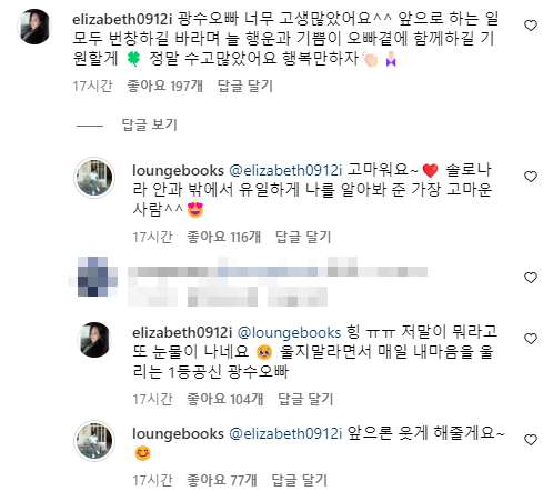 이 게시물에는 다양한 멤버들로부터의 응원 댓글이 쏟아졌다.