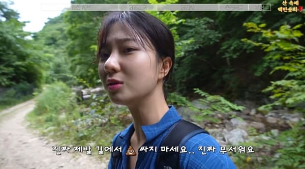 그런데 하산하는 과정에서 돌발 상황이 발생했다. 백만송희는 카메라를 켜며 "진짜 너무 무섭다"라고 말했다. 그는 "지금 내려가는 길 주 통로에 어떤 분이 바지를 벗고 볼일을 보고 계시더라"라고 전했다.