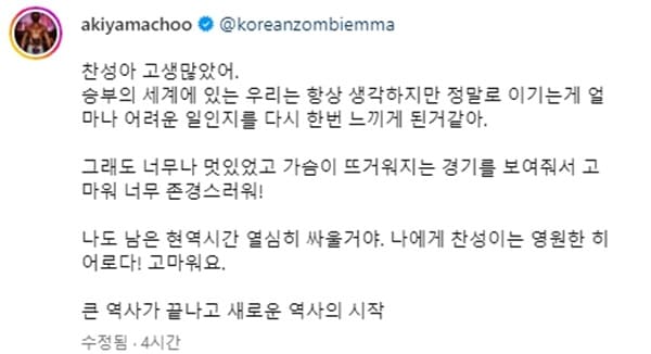 추성훈은 "승부의 세계에 있는 우리는 항상 생각하지만 정말로 이기는 게 얼마나 어려운 일인지를 다시 한번 느끼게 된 것 같아"라며 "그래도 너무나 멋있었고 가슴이 뜨거워지는 경기를 보여줘서 고마워. 너무 존경스러워"라고 했다.