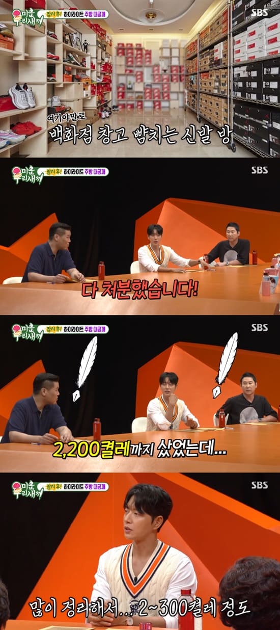 이어 신동엽이 “지금 남은 건 몇 켤레나 되냐”고 묻자 박해진은 “지금은 200~300켤레 정도 남았다. 창고에 안 신는 새 신발이 있다. 신고 있는 것들은 신발장에 보관한다”고 답했다. 서장훈은 “300켤레도 어디 두기가 쉽지 않을 텐데”라며 다시 한번 놀랐다.