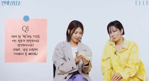 이날 영상에는 배우 전혜진과 최수영 등장해, 직접 구독자들의 연애 고민을 듣고 이야기를 하는 시간을 가졌다. 한 구독자는 "연애 전 썸 타는 기간은 어느 정도가 적당하다고 생각하시나요?"라고 고민을 보냈다.