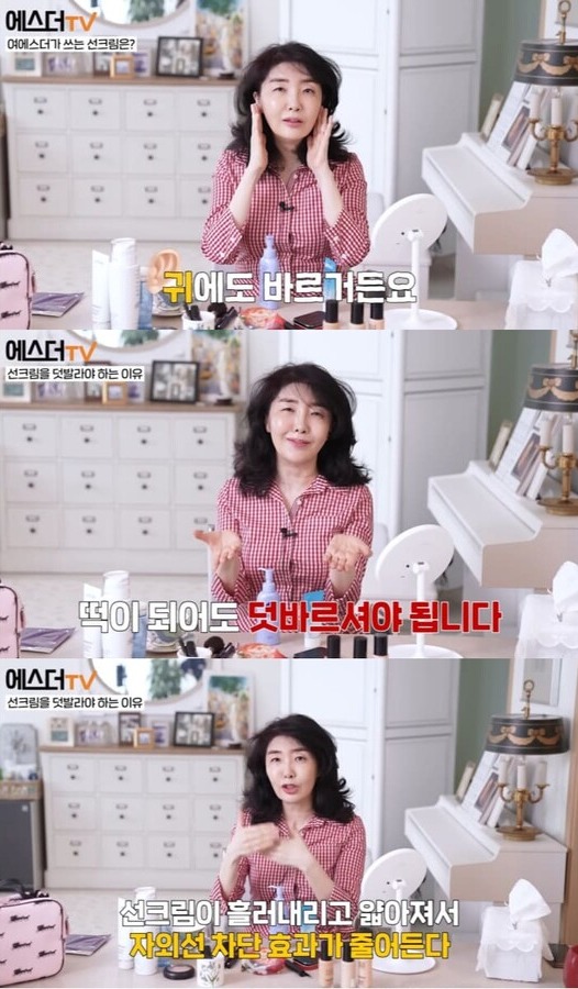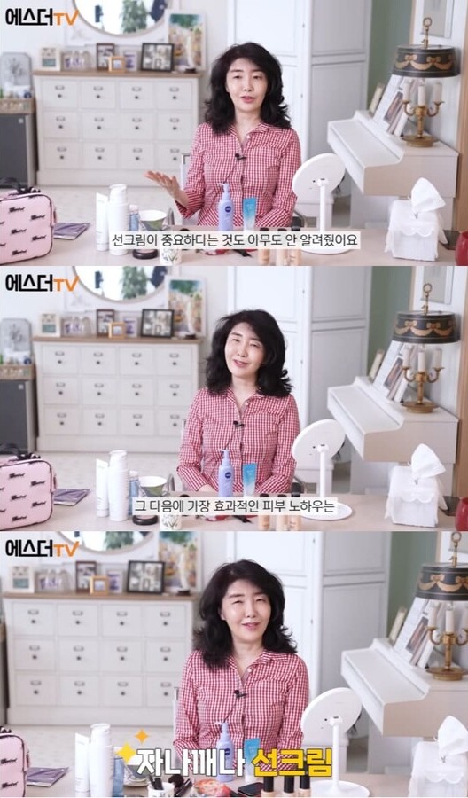 이어 여에스더는 "저는 솔직히 화장하기 전 제 피부가 더 좋다. 서른 살 이전에 저희 때는 선크림이 중요하다는 걸 아무도 안 알려줬다. 서른 살 때 선크림이 중요하다는 걸 알고 거의 30년 가까이 자나 깨나 선크림을 바른다. 제 가장 중요한, 가장 효과적인 피부 노하우는 자나 깨나 선크림, 귀까지 바르는 선크림에 있다"라고 전했다.