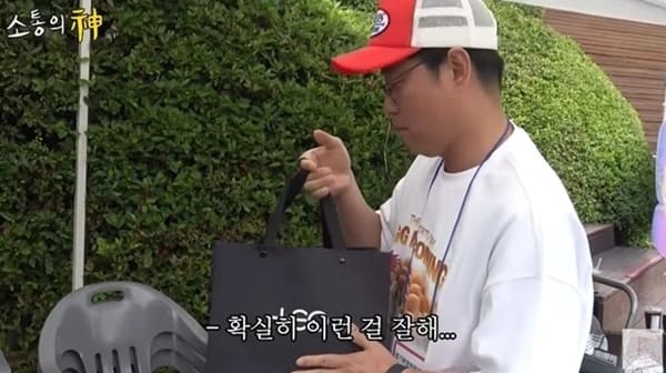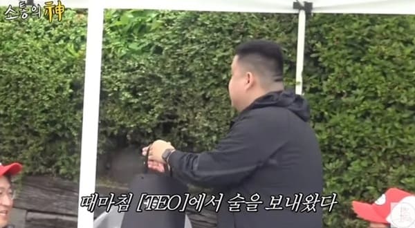 또한 TEO에서 보내온 체육대회 상품용 술도 소개했다. 술에는 TEO라고 새겨진 검정색 쇼핑백에 담겨 있었다. 나영석 PD는 "와 TEO 가방 너무 멋있다"라며 가방 디자인에 감탄했다. 그는 "우리도 (이렇게) 만들자. 어휴 술을 사줬네"라며 부러운 감정을 드러냈다.