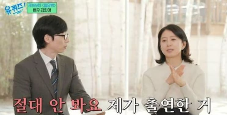김희애는 두 아들이 "제가 출연한 작품을 절대 안 본다."라며 "의도적인 것인지 재미가 없어서인지는 모르겠다. (오히려) 저는 그게 너무 좋다."라고 고백했다. 이에 MC 유재석은 "보면서도 일부러 이야기 안하는 걸 수도 있다. 엄마가 신경 쓸까 봐."라고 덧붙였다.