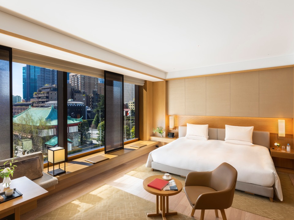 해자를 사이에 두고 고교 히가시교엔(東京 皇居東御苑) 건너편에 자리해 모든 객실과 스파, 레스토랑 등의 부대시설에선 도쿄 도심의 녹지가 한눈에 담긴다. 로컬 문화와 예술을 인테리어와 서비스에 고르게 녹여낸 것도 차별점. 1,000여 점의 예술 작품이 로비와 리셉션을 포함한 호텔 구석구석에 자리하고, 객실 내에는 에히메현의 명물 이마바리 타월, 도쿄의 유서 깊은 티 전문점 주케츠도의 차, 도치기현의 전통 도자기 마시코 찻잔과 900년의 역사를 지닌 이와테현 주물 찻주전자가 비치돼 있다. 1박 7만 엔부터, palacehoteltokyo.com