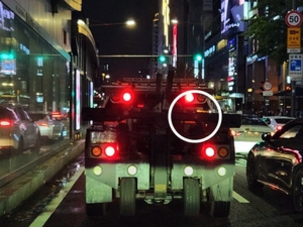 사진의 견인차 후면 번호판(흰색 원)은 견인기구로 가려져 있어 후방 차량 운전자 시야에서는 식별이 불가하다. 차량 후면 번호판이 이런 식으로 설치된 견인차는 적지 않은 것으로 알려진다. / 제갈민 기자 |