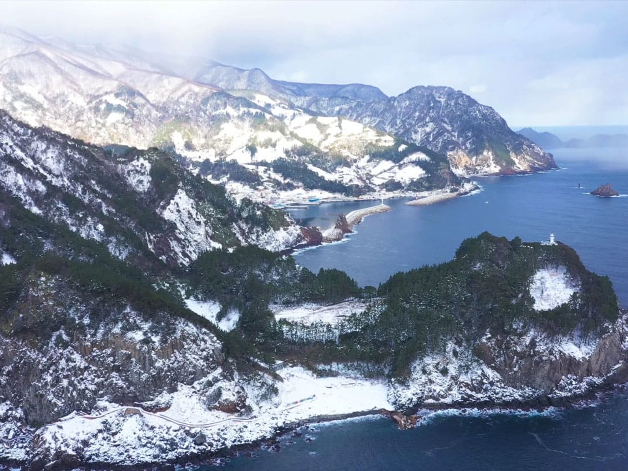 도동항은 울릉도의 관문이자 주요 항구로, 겨울철에는 한적한 어촌의 정취를 느낄 수 있는 곳입니다. 눈이 내린 도동항의 풍경은 평소와는 다른 고요하고 평화로운 분위기를 자아냅니다.