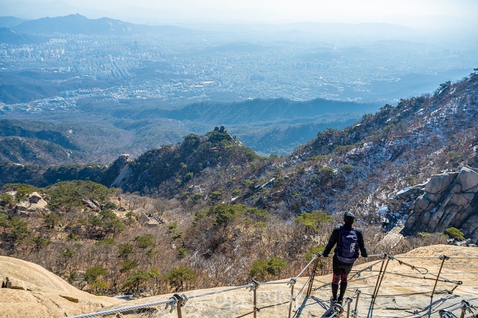 산길을 따라 백운대피소에 도착했다면 앞으로 20~30분만 더 가면 정상에 도착한다. 대피소부터 백운대 정상으로 가는 마지막 구간은 거대한 바위들이 연이어 이어지는 암봉 구간이다. 경사가 매우 급해 등산로에 설치된 와이어로프를 잡고 매달리듯 산을 올라야 한다. 백운대로 가는 길은 험하지만, 바위에 올라서면 발아래로 시원하게 서울의 도심 풍경이 드러난다.