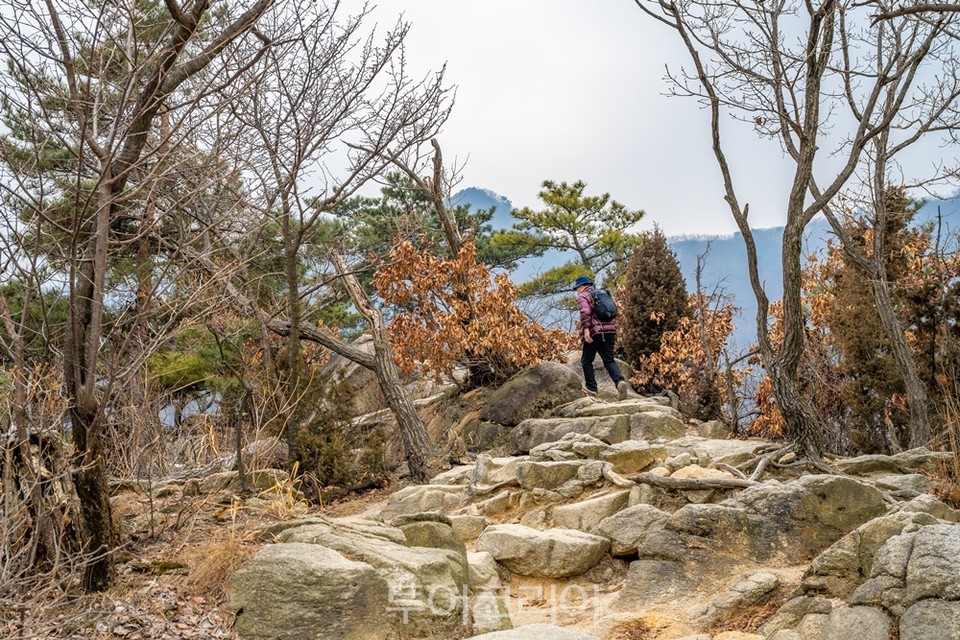 진달래능선에 올라서면 머리 위로는 시야가 트인다. 진달래능선은 4월 초․중순이 되면 능선을 따라 진달래가 꽃을 피워 북한산이 분홍색으로 곱게 물든다. 3월에는 아직 꽃이 피지 않지만, 꽃봉오리가 맺혀 있는 것이 보인다. 능선 중간중간마다 삐죽 튀어나와 있는 바위 위에 올라서면 서울 시내가 내려다보이는 포인트가 있다.