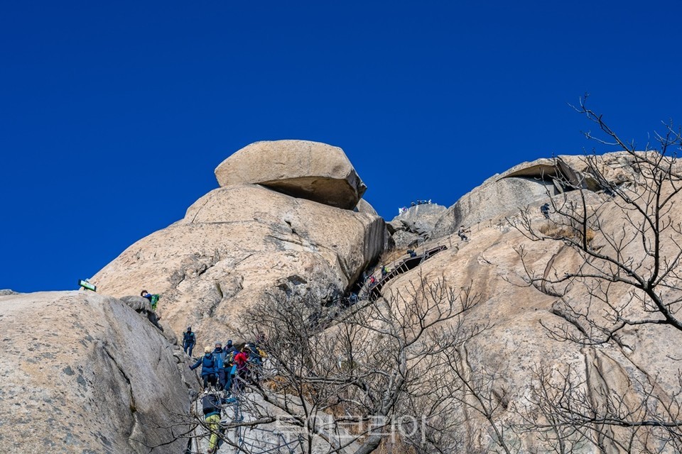 암봉을 타고 백운대를 오르는 등산객들 |