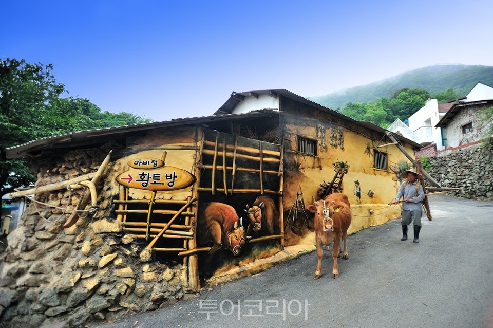 마을을 한 바퀴 돌아보면 국내 최고령 옻나무, 대나무 터널길, 이팝나무 터널길 등이 있어 자연과 호흡하는 삶이 느껴지고, 살아 움직일 듯한 ‘소’, 누렁이와 지게 등 정감 있는 벽화는 어른들이 느꼈을 옛 향수를 자극하고 인증샷 찍는 재미까지 누릴 수 있다.