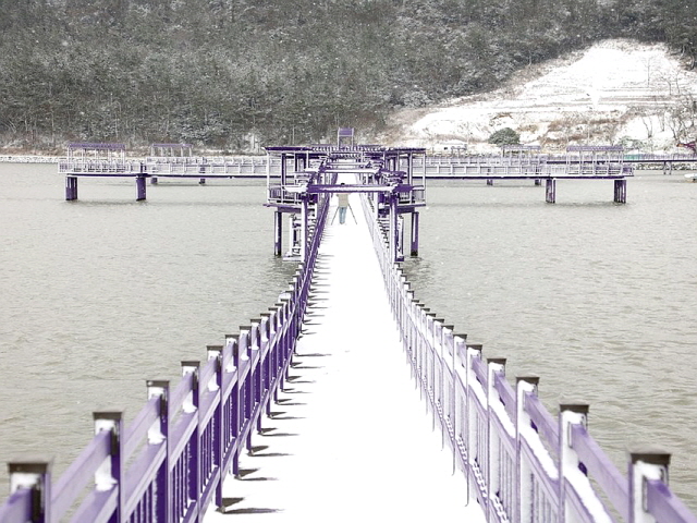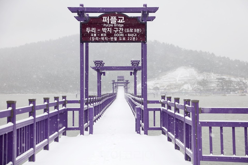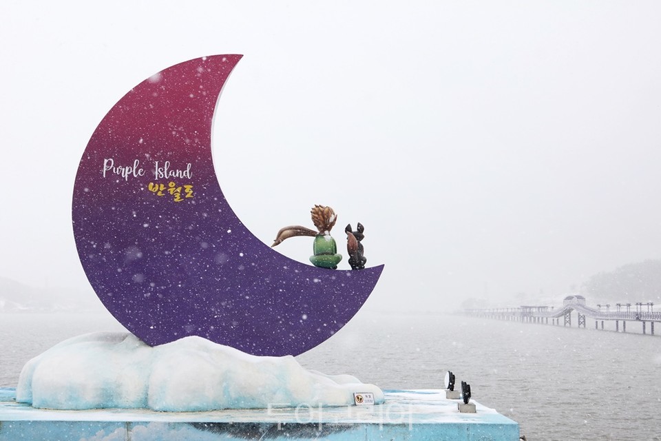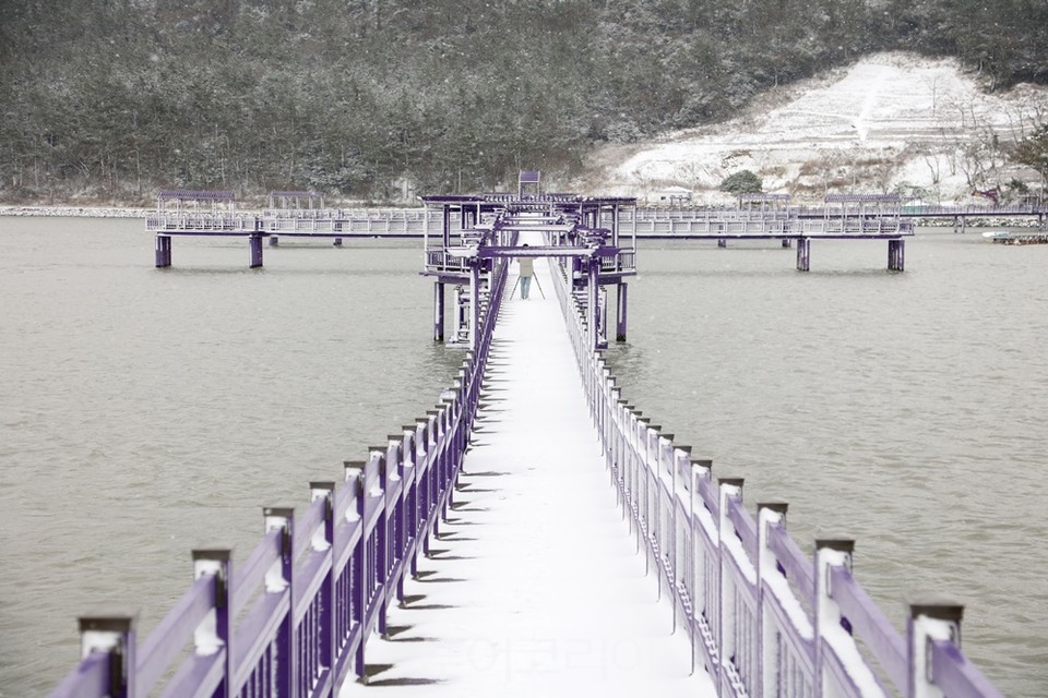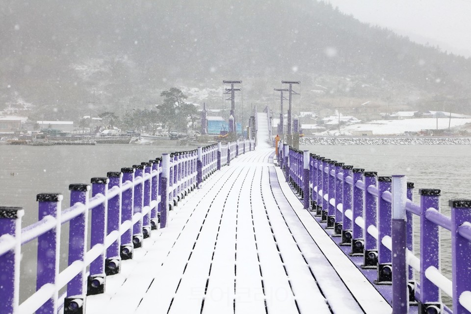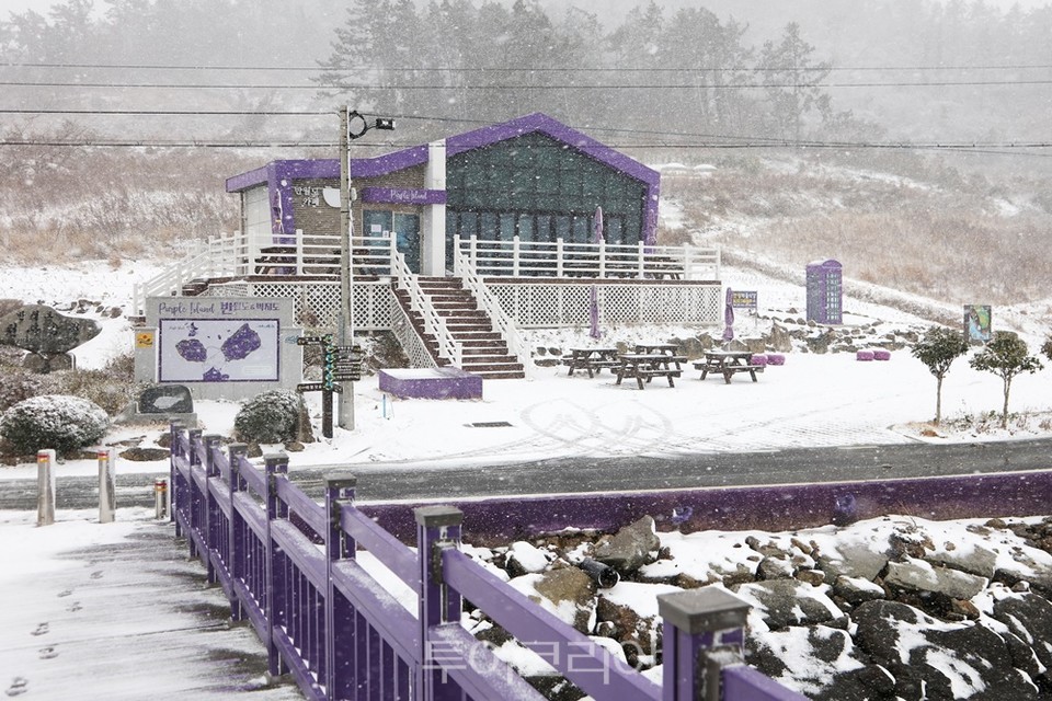 신안 안좌면 형제의 섬 반월·박지도 ‘퍼플바다정원’이 흰눈에 쌓여 환상적인 모습을 보여 주고 있다. 보라색 세상에 하연 눈에 내려앉은 모습은 몽환적이기까지 하다.