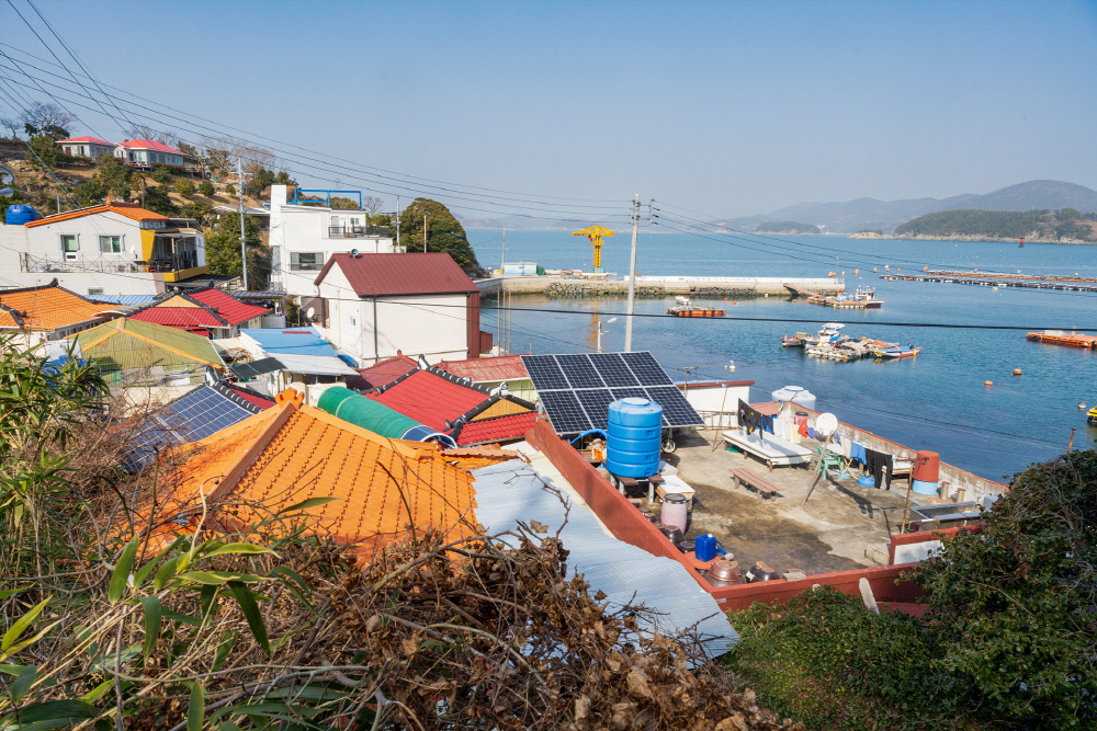 파란 바다색과 어우러져 이국적인 분위기를 자아내는 만지도 마을 지붕들 |