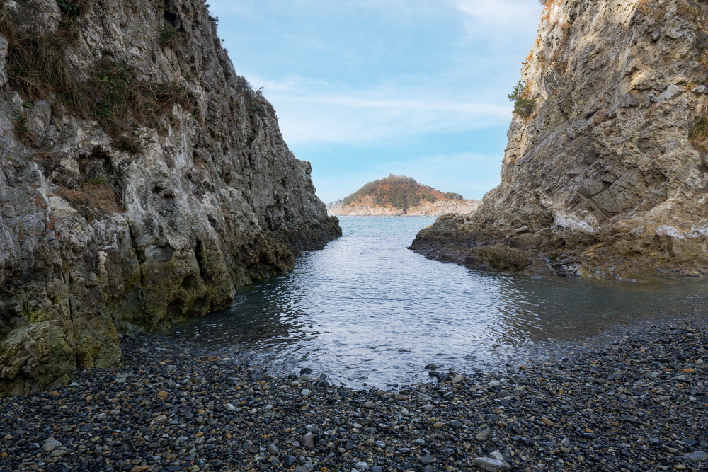 협곡을 연상케 하는 몽돌해변의 뒤편으로 섬처럼 떠 있는 만지봉 |