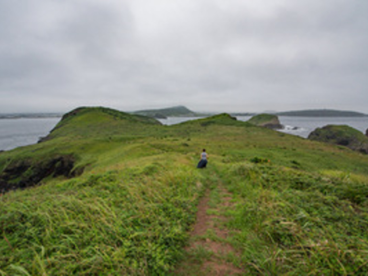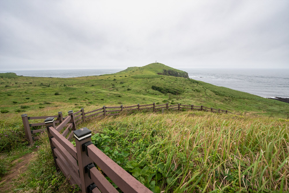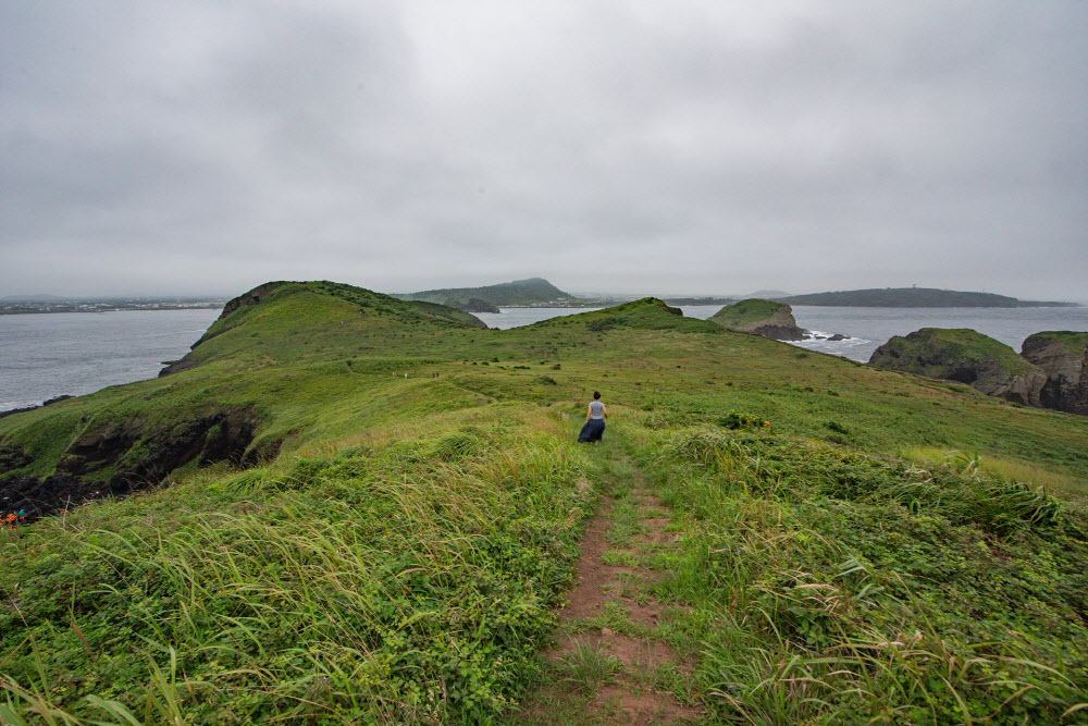 탐방로는 4.1km, 섬 둘레를 한 바퀴 돌아오는 코스다. 탄성이 연사로 이어질 만큼 길은 환상적이다. 초원 위 가르마처럼 난 길을 따라 걷다 보면 곧장 바다로 떨어질 것 같은 착각이 든다. 탐방객들은 약속이나 한 듯이 시계방향으로 걷는다. 해안가에 뾰족하게 솟아오른 시스택은 첫 번째 전망대의 주인공이다. 이름하여 ‘바위’, 신화에 의하면 제주도를 만들었던 설문대 할망 500명의 아들 중 막내다. 나머지 499명의 형은 한라산 영실의 오백 장군이 되었으니 함께 못한 사연이 깊다.