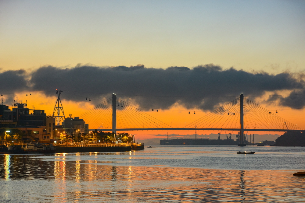 이른 아침 여수항에서 바라본 아파트와 거북선대교 |