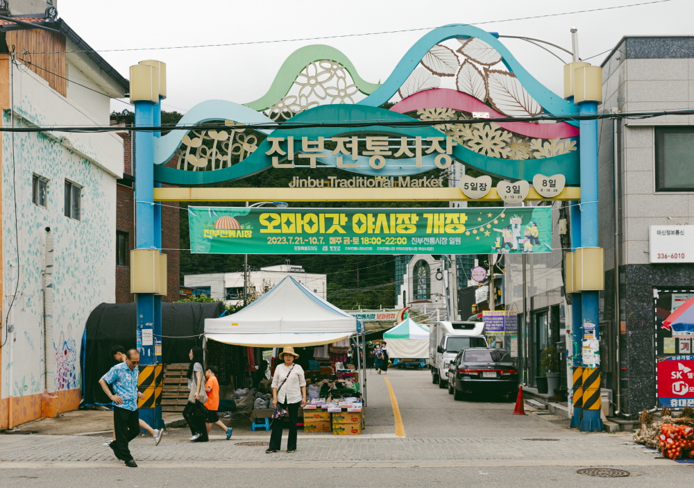 진부전통시장이 있는 하진부리는 아담한 동네다. 정겨운 옛 모습이 남아있어 동네 곳곳을 거닐다 보면 30~40년 전으로 돌아간 것 같은 기분이 든다. 좋은 인상으로 남았던 건, 단순히 낡고 오래된 지역이 아니라 잘 정돈돼 있으면서도 레트로한 분위기가 풍기다는 점이다.
