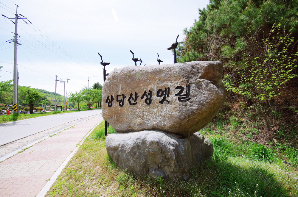 산성교차로 부근에 옛 고갯길을 알리는 비석이 있다. 비석에 ‘상당산성옛길’이라고 새겨졌다. 비석 뒤로 솟대가 보인다. 이 길을 걷는 사람들을 행복하게 해주는 정령 같다.