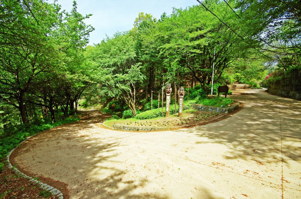 비석을 지나 차가 다니지 못하게 막아놓은 곳에 도착했다. 안내판에 따르면 2009년에 새 도로가 생기면서 이 길은 산책길이 됐다. 차는 물론 자전거도 다닐 수 없게 했다. 약간의 오르막길이 이내 끝내고 고갯마루가 나왔다. 고갯마루 위 공중에 것대산과 상당산성을 잇는 출렁다리가 보인다. 이제부터 전부 내리막길이다. 길은 포장된 도로지만 주변은 다 산이고 숲이다. 구불거리는 고갯길이 시작되는 곳에 상당산성과 것대산 등으로 갈 수 있다고 알려주는 등산로 이정표도 보인다. 우뚝 선 장승, 천하대장군과 지하여장군은 삿된 기운이 이 길에 범접하지 못하게 막아주는 상징이다.