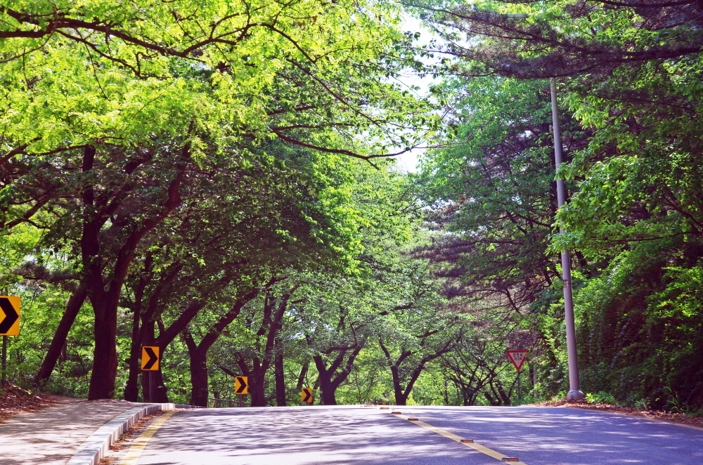 율량동으로 내려가는 길을 가리키는 안내판을 지난다. 나무들이 도로 위를 덮었다. 초록의 ‘숲터널’이다. 오가는 차가 없을 때는 초록의 ‘숲터널’ 속으로 구불거리 이어지는 길이 아름답게 보이기도 한다. 곡선의 부드러움과 길이 품은 상징 같은 서사가 초록 ‘숲터널’ 속에서 꿈틀대는 것이다.