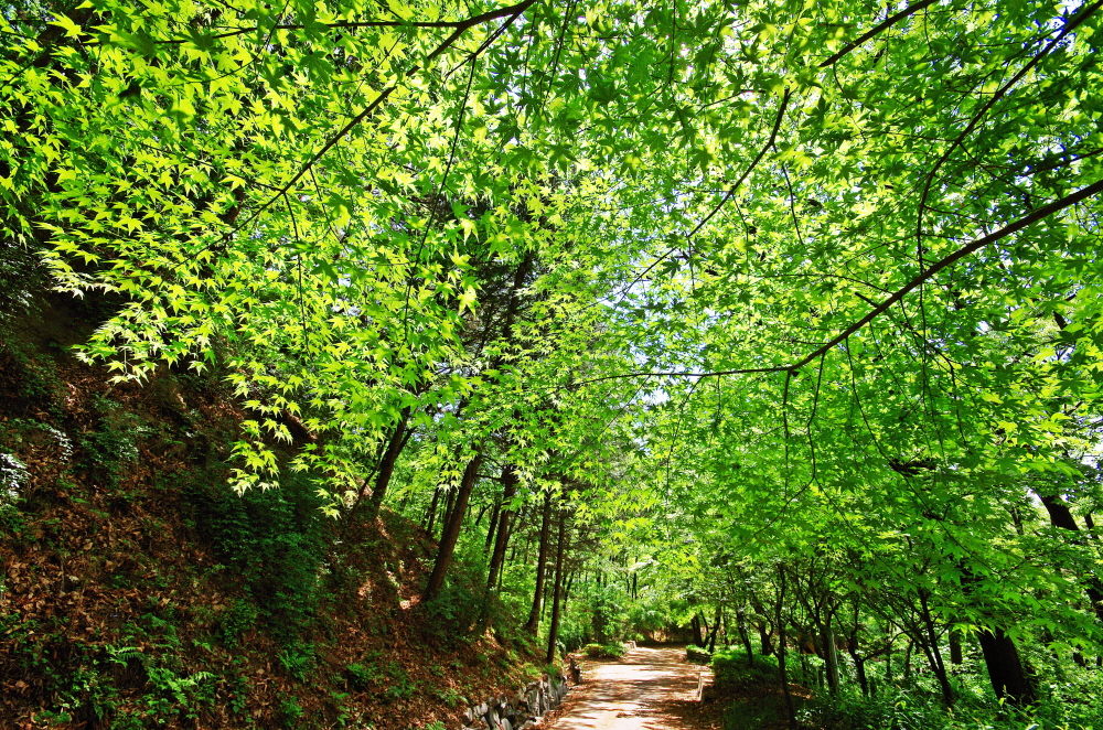 산굽이를 휘감고 도는 물줄기처럼 길은 굽이쳐 돌며 아래로 흘렀다. 파란 하늘에 하얀 구름 떠 있어 하늘은 더 파랬다. 커다란 나무들이 하늘을 가리면 햇볕은 숲 밖에서 나뭇잎 하나하나를 비춘다. 그렇게 형광빛 초록이 길을 밝히는 ‘숲터널’을 걷는다.