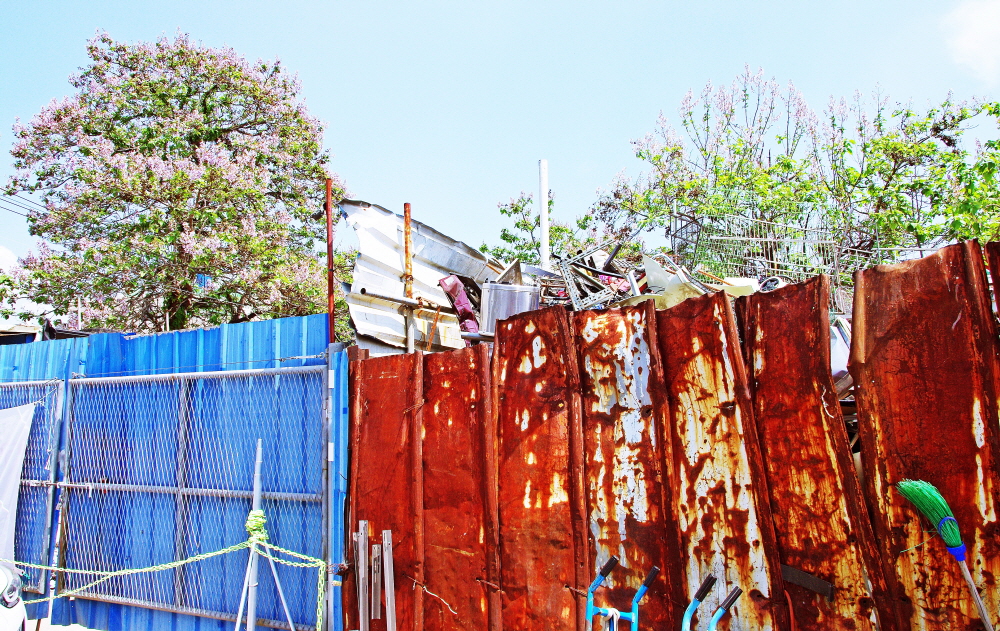 녹슨 양철벽 고물상 한쪽에 오동나무가 꽃을 피웠다. |