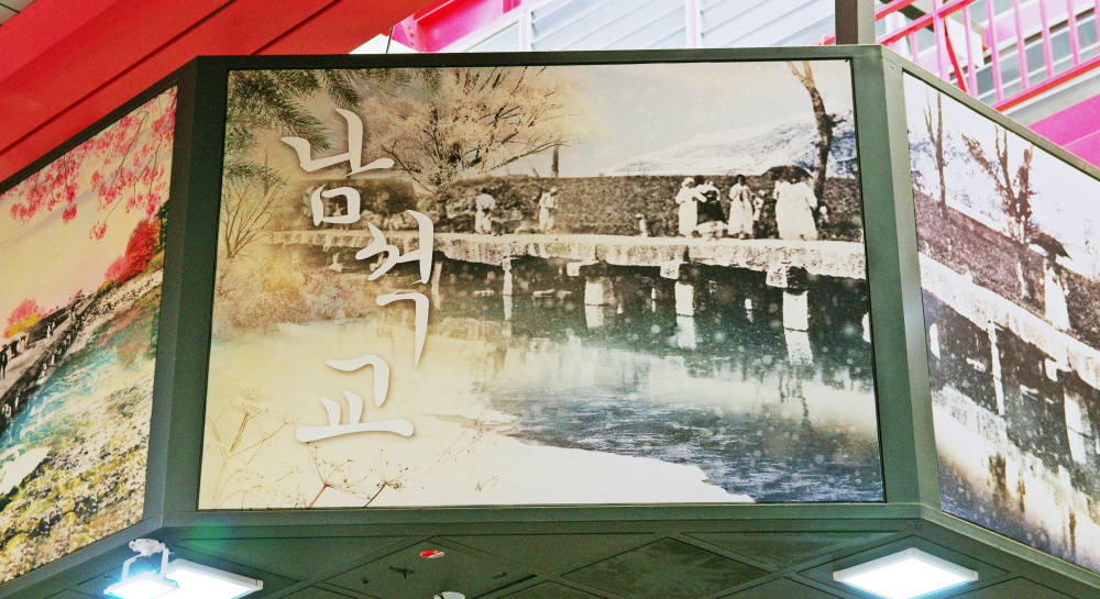 남석교가 묻힌 자리 위, 육거리종합시장 천장에 걸려 있는 남석교 옛 사진 |