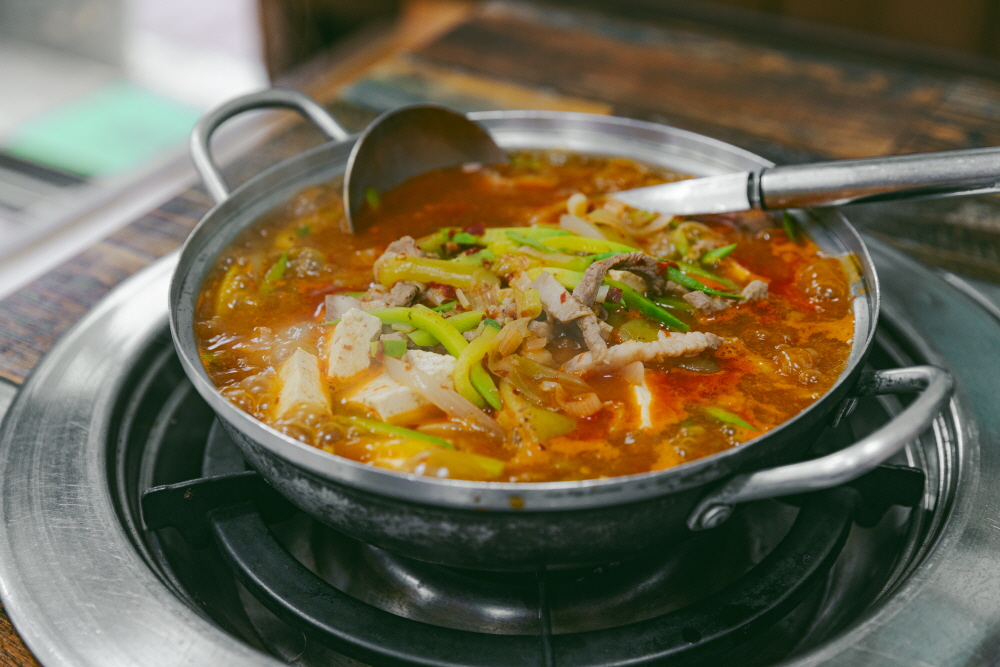 해남 로컬 식당의 분위기를 느끼고 싶다면 서성식당이 좋은 목적지가 된다. 감자탕과 애호박찌개, 돼지머리고기 세 메뉴가 중심이 되는 식당으로 현지인과 여행객 모두 즐겨 찾는 곳이다. 밑반찬부터 심상치 않다. 애호박찌개가 나오기 전에 소망식당처럼 밥 한 그릇 뚝딱 해치울 수 있는 수준이다. 게다가 기어코 반주를 하게 만드는 머리고기도 제공된다. 판매 중인 머리고기의 맛보기 버전인데 안주로 활용할 수 있을 정도의 양이 나온다. 해남의 인심을 엿볼 수 있는 대목이다.