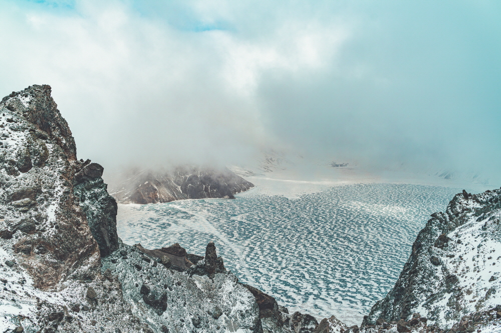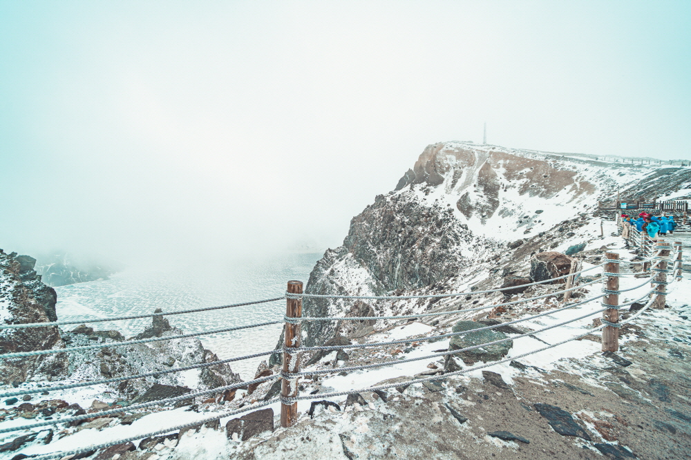 천지 방향으로부터 매서운 칼바람이 뿜어져 나오고 있었다. 어마어마한 양의 구름과 안개가 사방을 뒤덮었다. 천지 괴물, 너 이 녀석. 몽환적인 분위기를 연출하고 싶었던 거니. 천지에 다가갈수록 조금이라도 보이지 않을까 싶었던 희망은 아쉬움으로 바뀌어만 갔다.