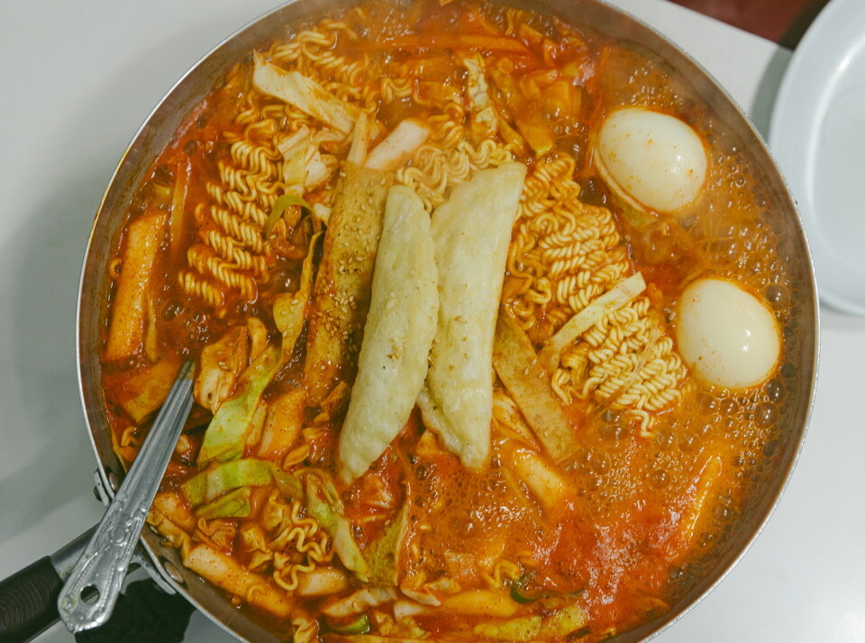 상호명에 나와 있듯이 끓여 먹는 즉석 떡볶이가 주인공이다. 여기에 계란, 만두, 라면, 쫄면, 오뎅, 치즈 등의 토핑을 곁들일 수 있고, 라면, 콩국수, 떡만두국 같은 단품 메뉴도 있다. 부드러우면서도 쫄깃한 밀떡을 활용한 떡볶이는 적당한 매콤함과 달콤함으로 계속해서 먹게 한다. 라면 사리와 계란, 어묵도 훌륭한 조연이 된다.