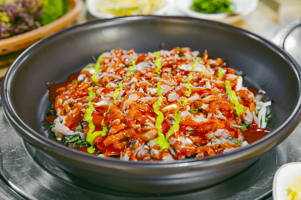웅어도 생소한데, 웅어회는 더 낯설게 느껴진다. 하지만 알고 보니 임금님이 드시던 진상품 중 하나이며, 고양의 특색 음식이라고. 식당에 따라 다르겠지만, 자유로민물장어웅어회의 웅어회는 잘게 채 썰어서 나온다. 회 밑에 깻잎 등 채소를 깔아서 내고, 초고추장과 고추냉이를 소스처럼 둘러준다. 사장님의 화려한 손놀림으로 비비면 간이 딱 맞는 웅어회가 완성된다.
