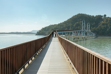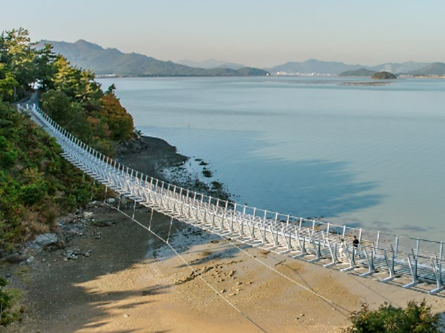 섬 중앙에는 청자 모양의 타워가 보인다. 5분 정도 모노레일을 타고 올라가면 주변 풍경을 조망하기 한결 수월하다. 섬 뒤쪽으로 길이 150m 출렁다리를 따라가면 가우도 생태탐방로, ‘함께해(海) 길’이 이어진다. 2시간가량 해안가를 걸으며 힐링할 수 있는 트레킹 코스다. 실루엣으로 비친 다산다리의 형상이 소의 뿔처럼 뾰족하고 웅장하다.