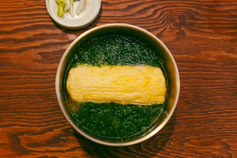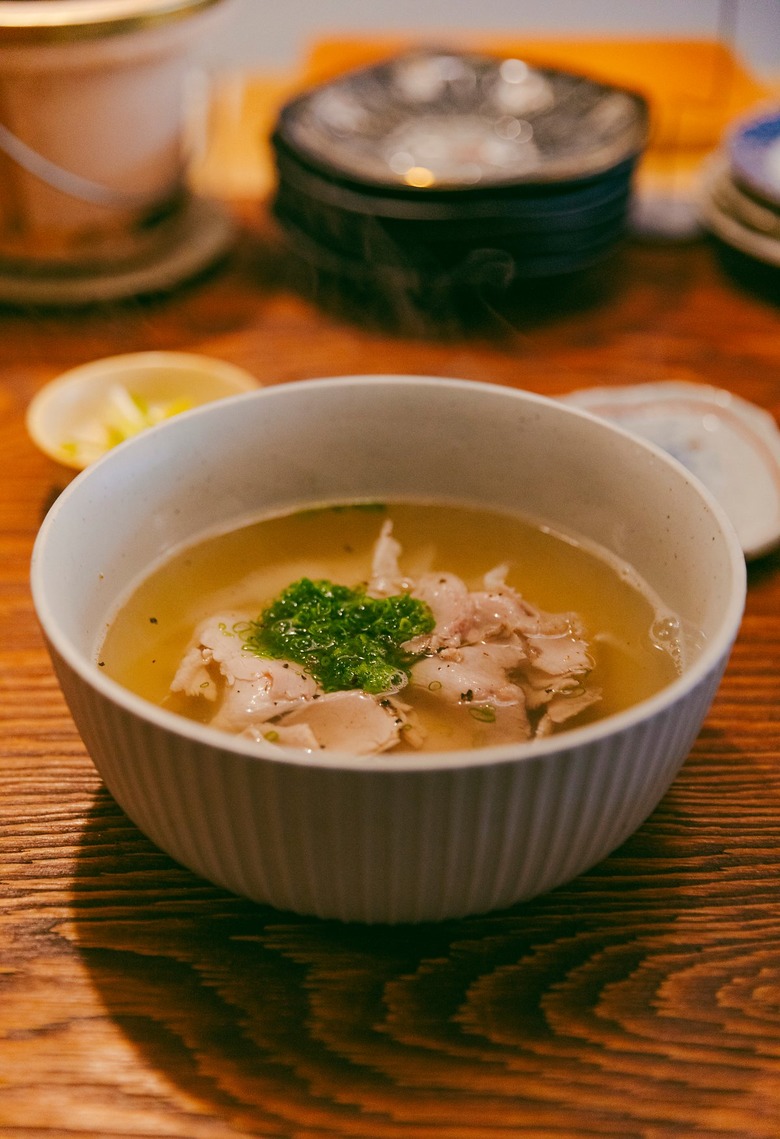 파랑국수는 생김새부터 눈길을 사로잡는다. 상당한 크기의 달걀말이가 그릇의 정중앙을 꽉 채우고, 남은 부분은 잘게 썬 파가 덮는다. 그 아래 얇은 면이 둥지를 트고 있다. 단순한 요리처럼 보이지만 맛과 재미는 뚜렷하다. 따뜻한 계란말이와 약간 시원한 면과 육수, 메뉴 설명처럼 적당히 차갑다는 말이 딱 맞다. 가쓰오부시 향과 적당히 짭조름하면서 달큼한 육수와 계란말이, 파가 조화를 이룬다. 돼지국밥은 티 없이 맑다. 상당히 개운한 스타일이라 누구나 부담 없이 즐길 수 있을 것 같다.
