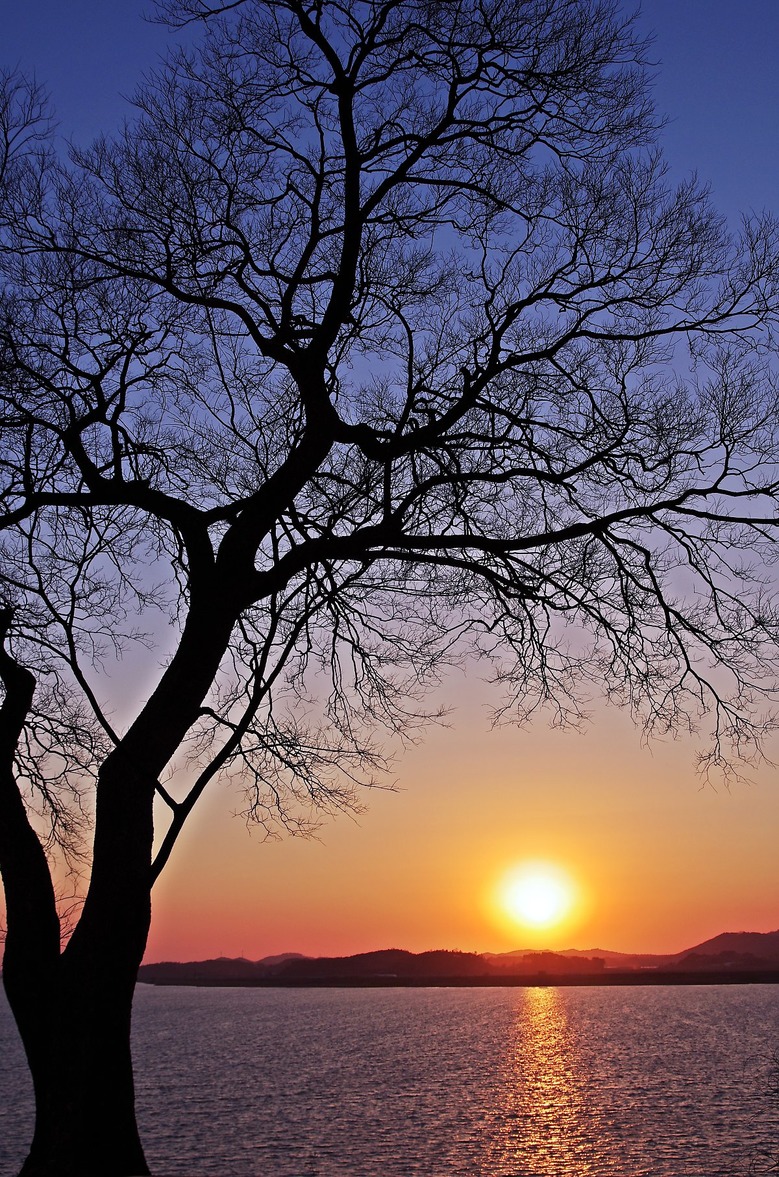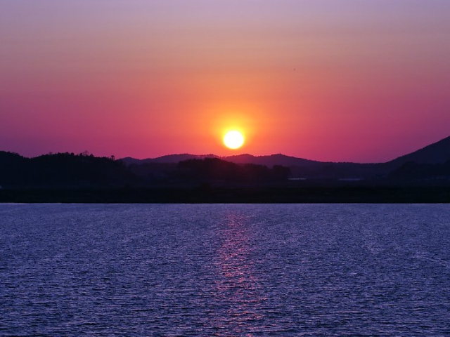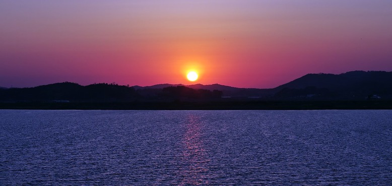 해가 지는 쪽 강 건너편은 충남 서천 신성리 갈대밭이다. 영화촬영지로 유명한 신성리 갈대밭 뒤로 해가 진다. 하늘과 강물을 비추는 황금빛 햇볕이 찬란하다. 언덕에서 내려와 언덕을 바라본다. 나뭇가지 사이로 햇볕이 갈라지며 비친다. 강렬한 빛 때문에 거대한 나무와 정자가 그림자처럼 보인다. 다시 언덕으로 올라가 모습을 감추는 해를 바라본다. 해가 떨어진 뒤 하늘의 색은 세 번 바뀐다. 마지막으로 보랏빛이 하늘에 퍼진다.