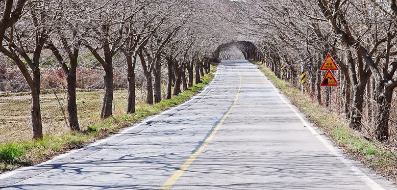 함라마을을 돌아보고 함라산 임도 산책로를 걷기로 했다. 웅포면 송천리 송천사거리에서 송천마을로 가다가 임도로 접어드는 길로 들어간다. 그 전에 이 부근에 있는 유명한 벚꽃길을 먼저 찾아봤다. 빈 나뭇가지만으로 이루어진 나무 터널도 볼만한 데 벚꽃이 피어나면 어떨까? 상상해본다. 꽃 피는 봄이 오면 벚꽃 터널을 보러 다시 올 생각을 하고 함라산 임도 산책길로 접어들었다.
