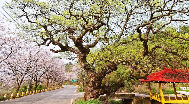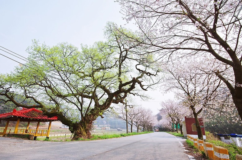전시관 앞 도로는 벚꽃길이기도 하다. 시내버스 정류장 앞 거대한 고목에서 돋아나는 푸르른 새잎과 벚꽃길에 피어나는 하얀 벚꽃이 어울린 봄 풍경이 아름답다.
