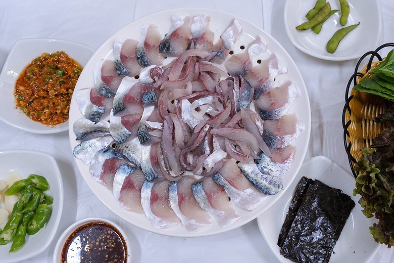 무엇보다 배지근한 고등어와 고소함의 끝판왕 전갱이를 함께 먹을 수 있다는 점은 대단히 매력적이다. 모듬회를 주문하면 고등어로 원을 그리고 그 안에 전갱이를 배치해서 나온다.