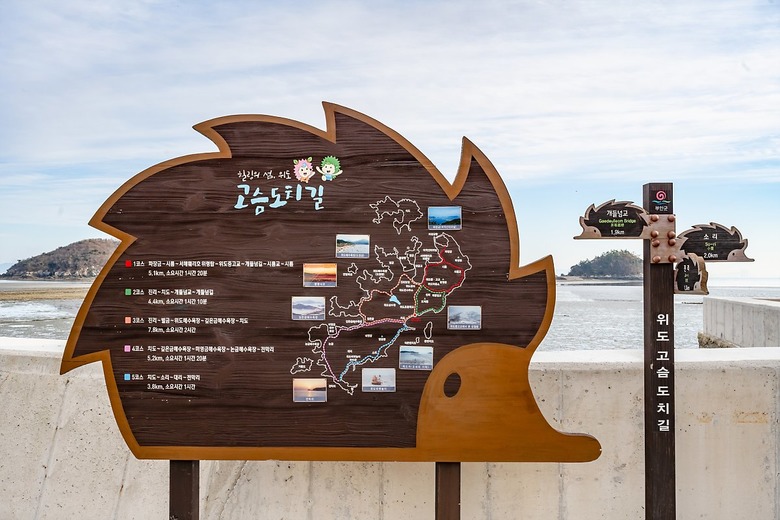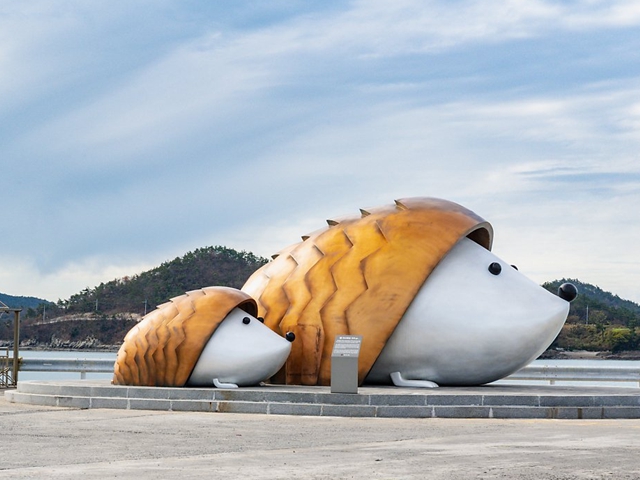 특히, 전설은 독창적이며 유일할 때 의미가 존중된다. 참고로 홍길동의 율도국은 오키나와의 미야코지마(宮古島), 심청전과 인당수의 이야기는 백령도에서도 전해진다. 위도의 위(蝟)는 고슴도치를 의미한다. 몇 년 전부터 고슴도치는 섬의 확고한 상징이 되었다. 스폿마다 세워진 조형물과 안내판 그리고 5코스로 조성된 걷기 길의 이름도 고슴도치다. 쉽고 단순하니 좋다. 선착장에서 여행객을 반기는 고슴도치 모자상도 정겹다.