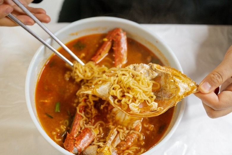 얼큰한 꽃게라면 한 입,