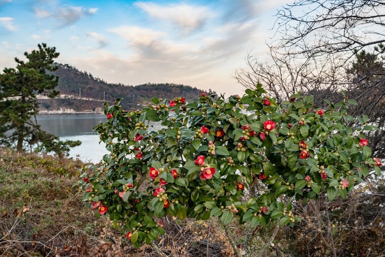 겨울이 되자 섬 동백이 활짝 꽃봉오리를 열었다 |