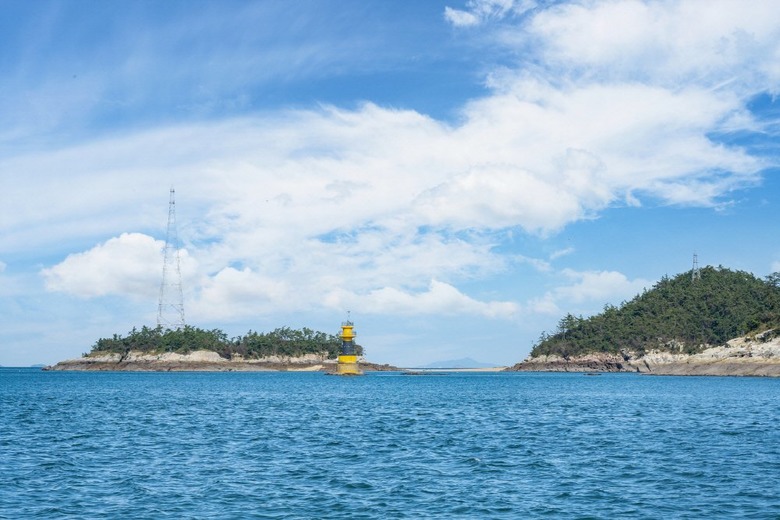 정금도와 딴정금도의 육계사주 위로 지나는 배는 식도로 가는 중이다 |