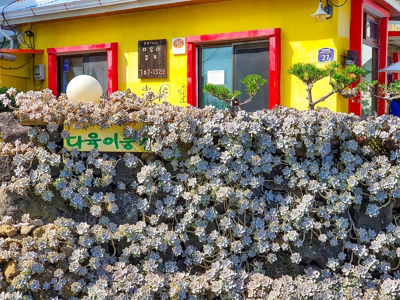 우리의 옛 시간을 되돌아보며, 이제는 쇠소깍으로 뚜벅뚜벅 걸어간다. 가는 도중 다육이로 뒤덮인 돌담을 볼 수 있다. ‘다육이풍경’이라는 작은 식당의 친환경적 외관인데, 돌담뿐만 아니라 진입로도 다육이로 꽉 차 있다. 쉽게 볼 수 없는 광경에 다소 놀랄 수 있지만, 보말수제비와 비빔밥 등 간단한 식사와 음료를 즐길 수 있는 식당이다.