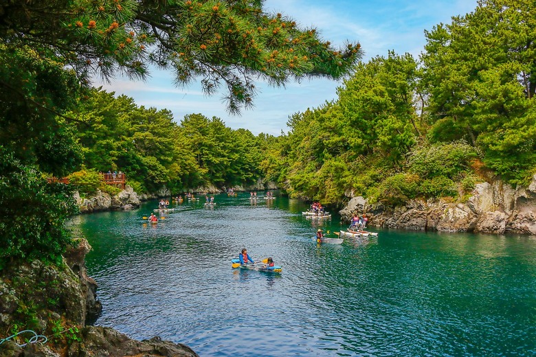 서귀포 하효동 여행의 꽃은 단연 쇠소깍이다. 신비한 계곡의 느낌이 충만한 이곳은 제주 현무함 지하를 흐르는 물이 분출해 바닷물과 만나 깊은 웅덩이를 형성했다. 쇠소깍은 제주도 방언인데, ‘쇠’는 효돈마을, ‘소’는 연못 뜻하고, ‘깍’은 접미사로서 끝 한다. 좀 더 가깝게 이곳과 교감하고 싶다면 전통조각배 또는 제주 전통 뗏목 ‘테우’를 타는 것도 좋다.