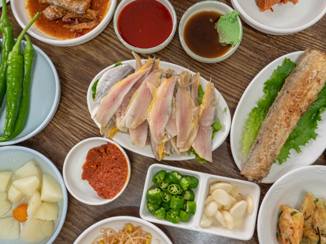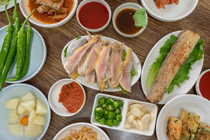 반지회, 갈치구이 한토막, 반찬 예닐곱 가지가 가득 오르는 해성식당의 반지회 정식 한 상 |